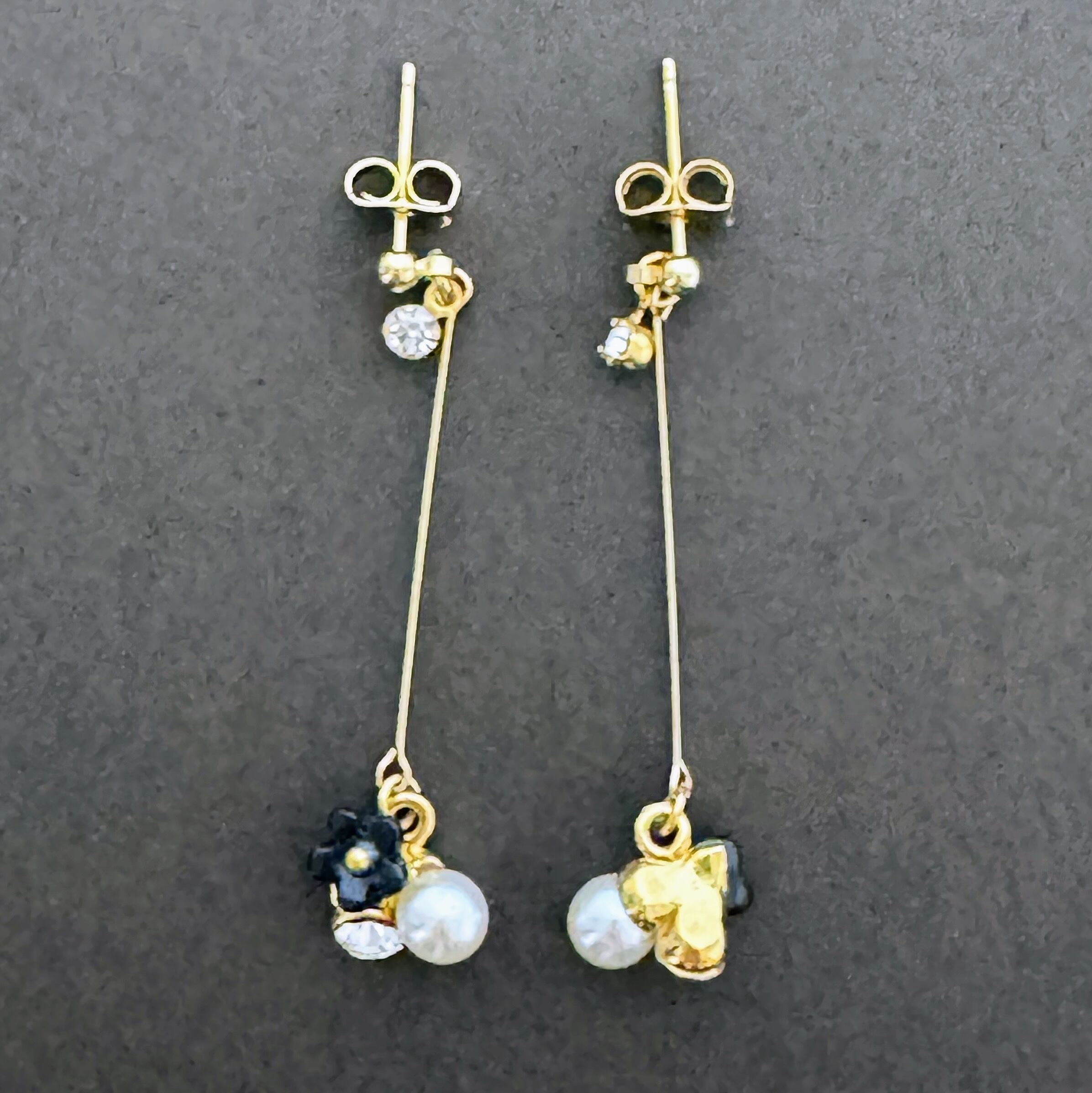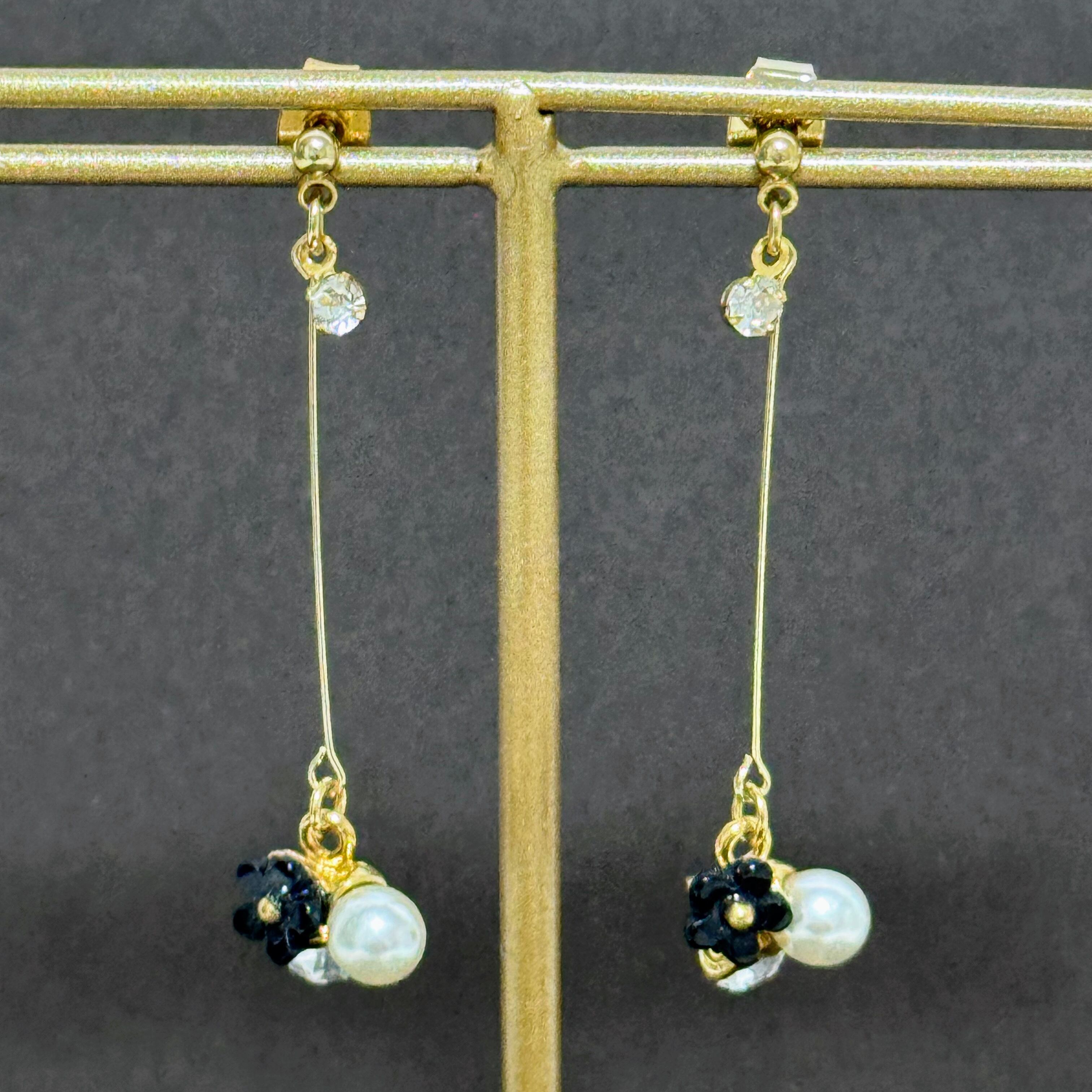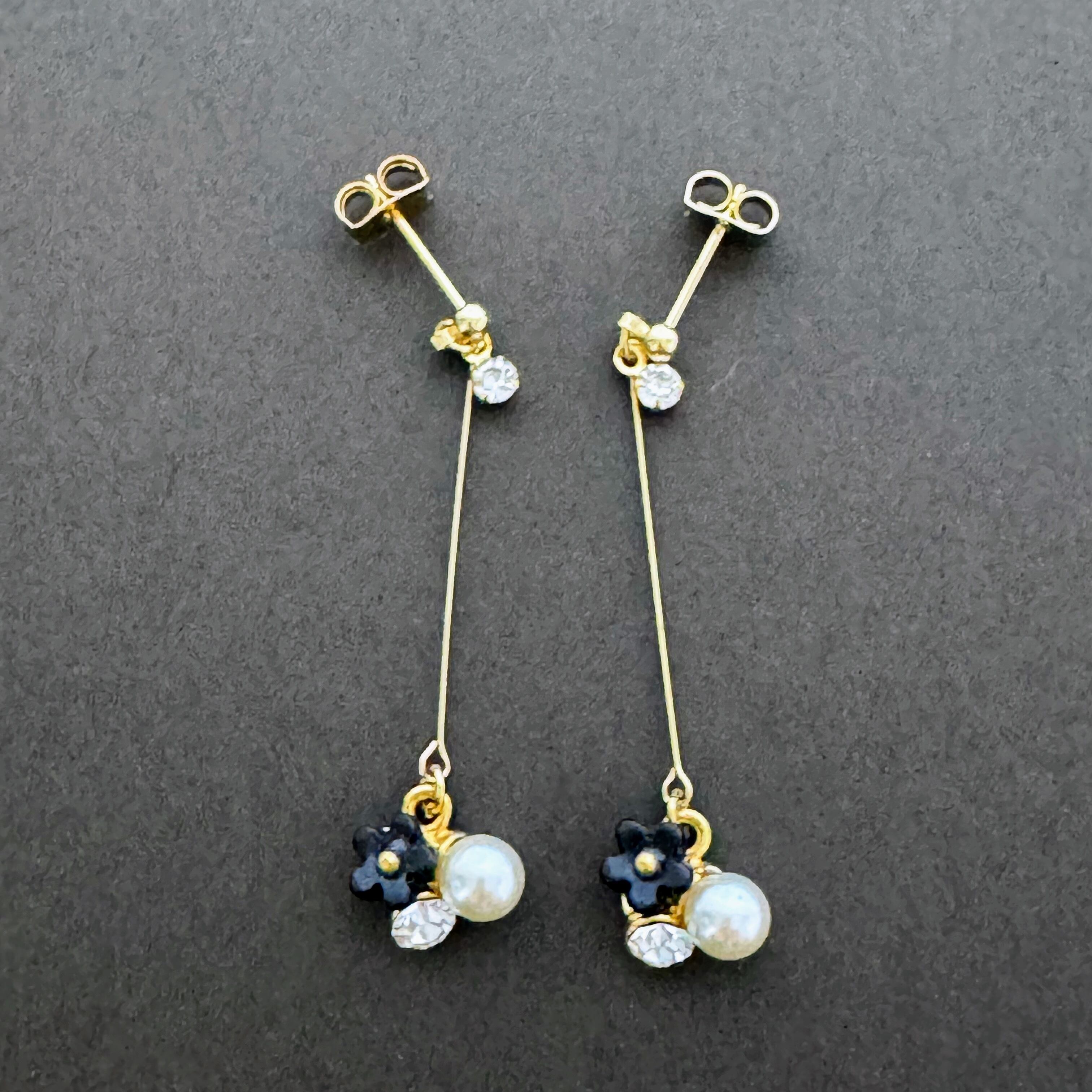 華やかな花モチーフが耳元で輝く♡ゴールドパールブラックフラワーモチーフラインストーンピアス
