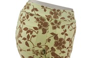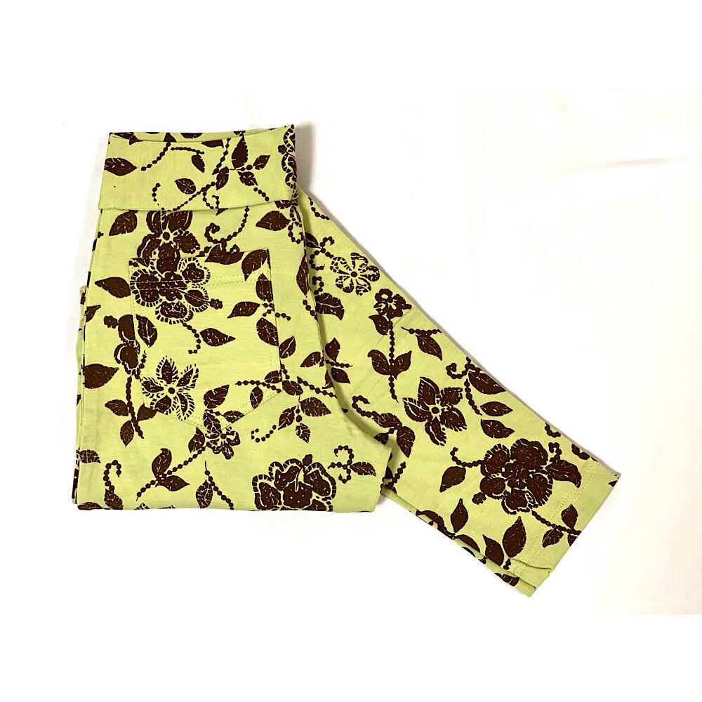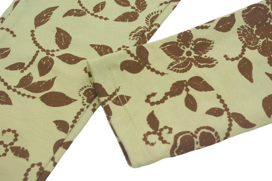 やわらかなグリーンベースにブラウンのお花が咲いた全体的に優しくトップスにあわせやすい柄になります。