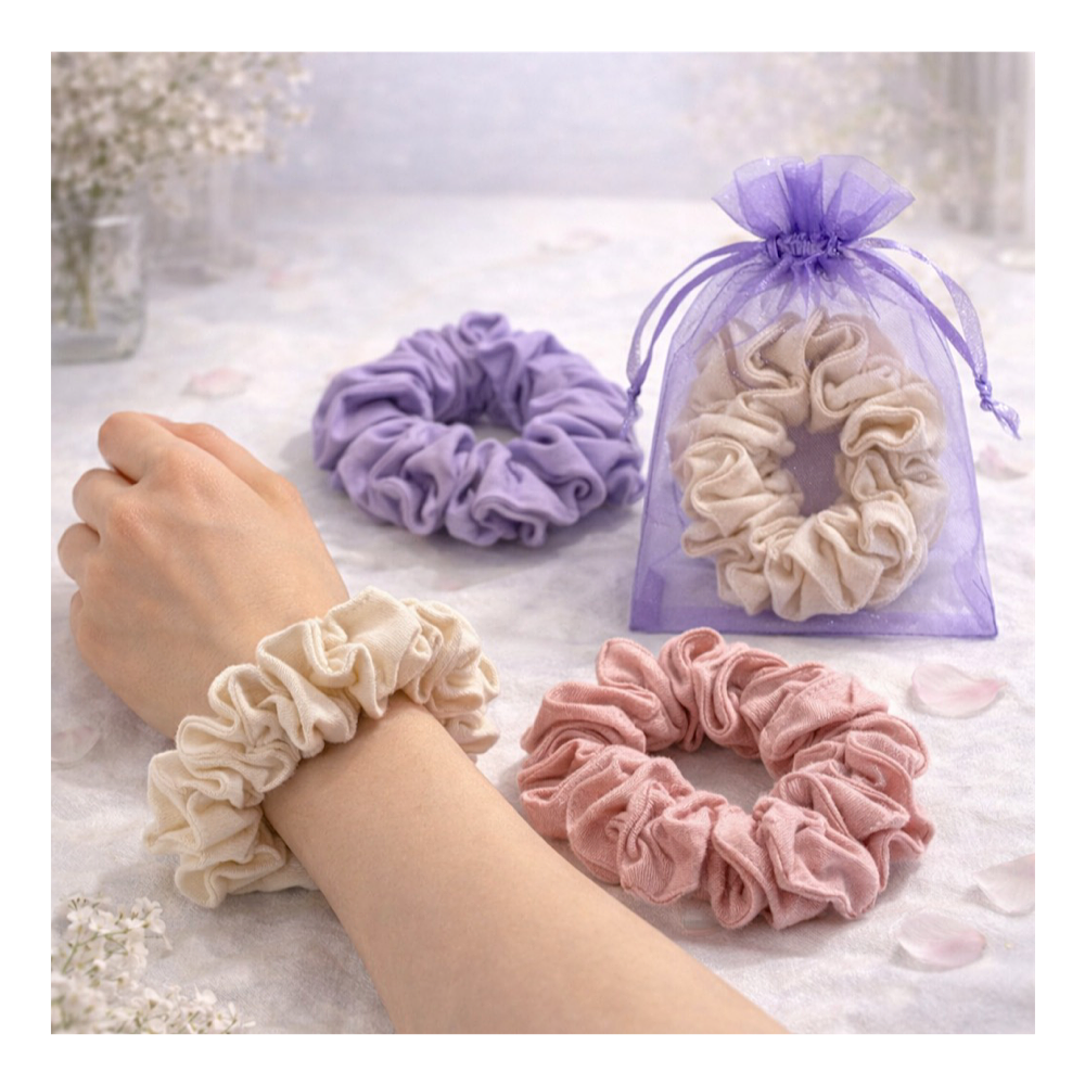 プレゼントにも◎髪をすっきりまとめたい全ての方へ!ブレスレットとしても使用できるコットン綿素材の手染めのムラ染めシュシュ:オフホワイトorパープルorピンク