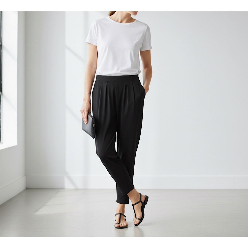 ●❤ひんやり心地で気持ち良い接触冷感❤穿き心地抜群⤴美脚快適テーパードパンツ:1サイズで7~13号対応!黒ピュアブラックを1本